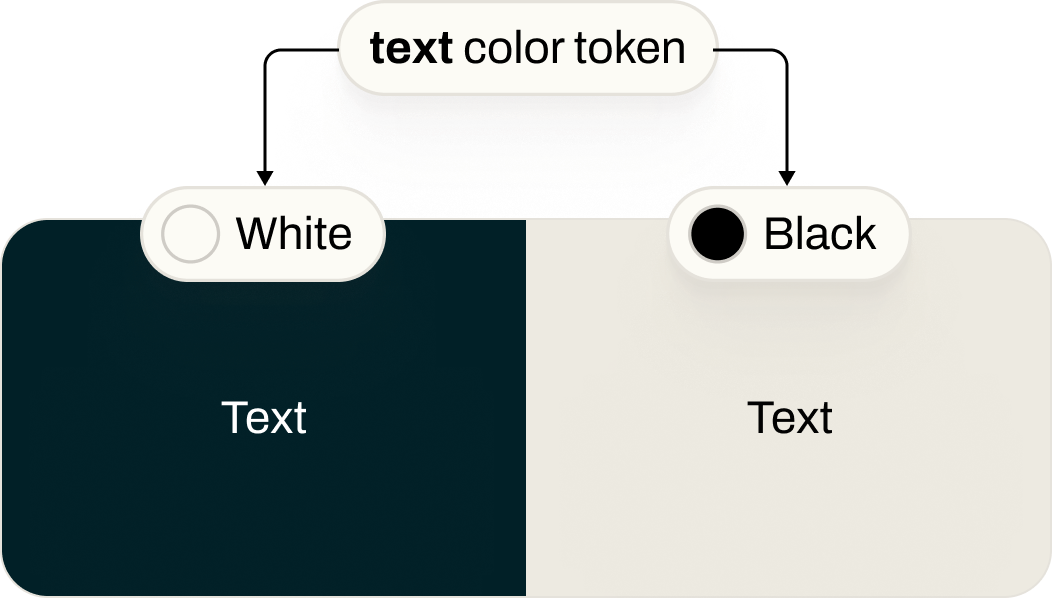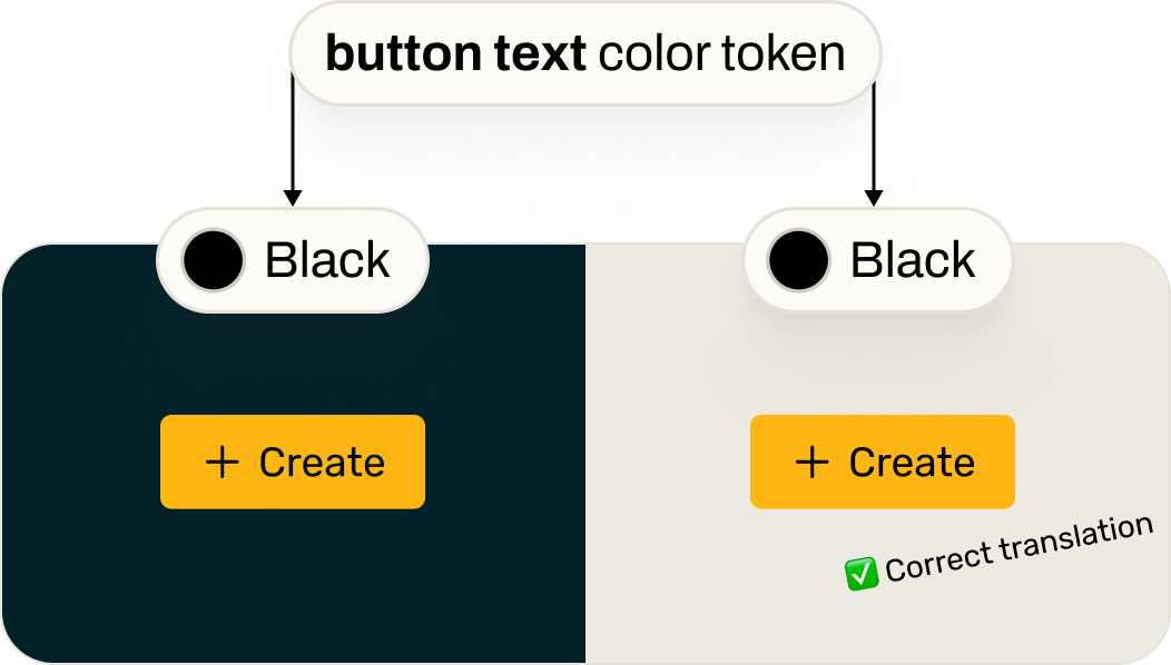 To fix this, we introduced a layer of semantic tokens. These define colors by their purpose — for example, a “text color” or “button text color” token — each with appropriate color references for light and dark themes.