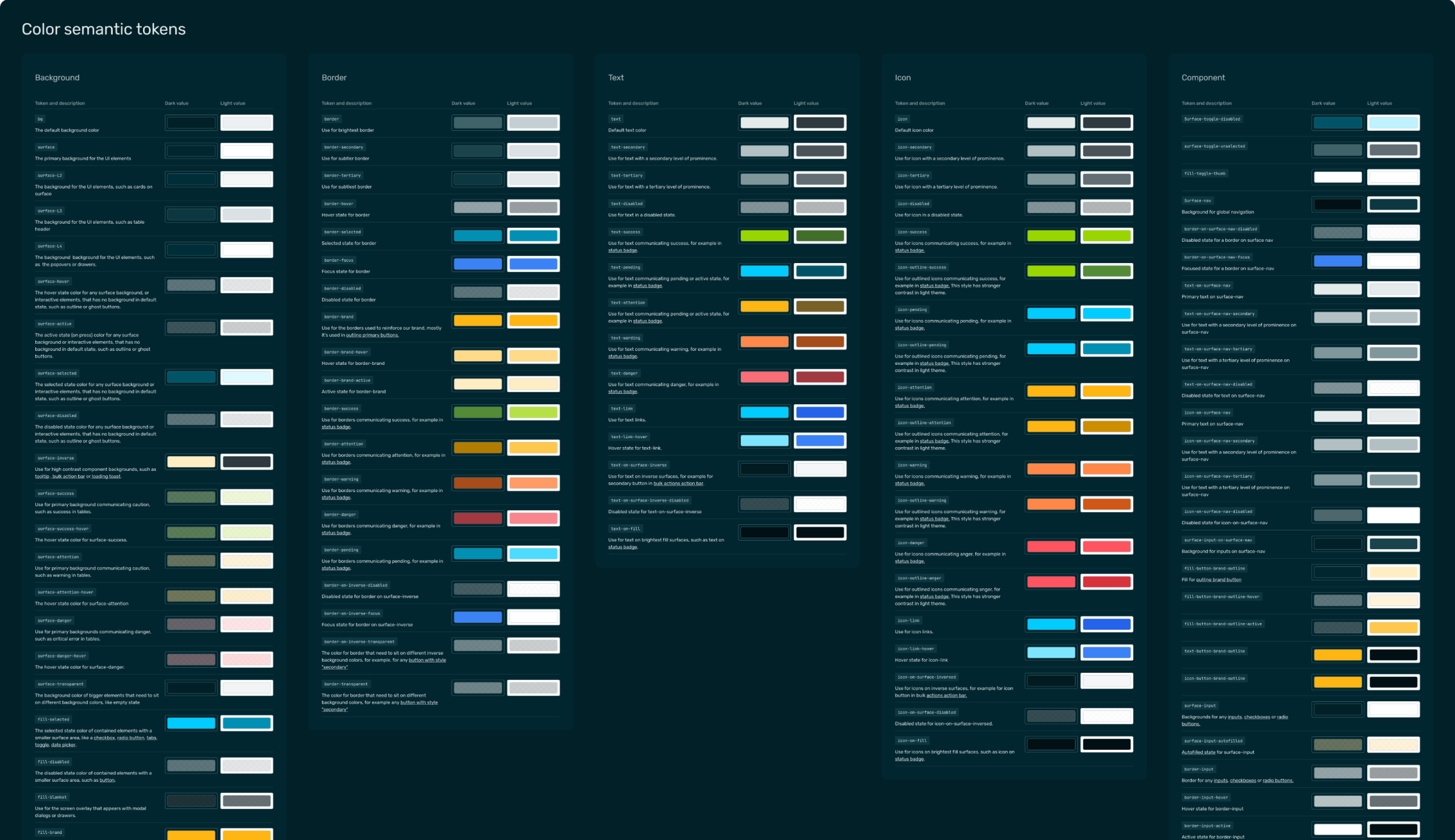 To fix this, we introduced a layer of semantic tokens. These define colors by their purpose — for example, a “text color” or “button text color” token — each with appropriate color references for light and dark themes.